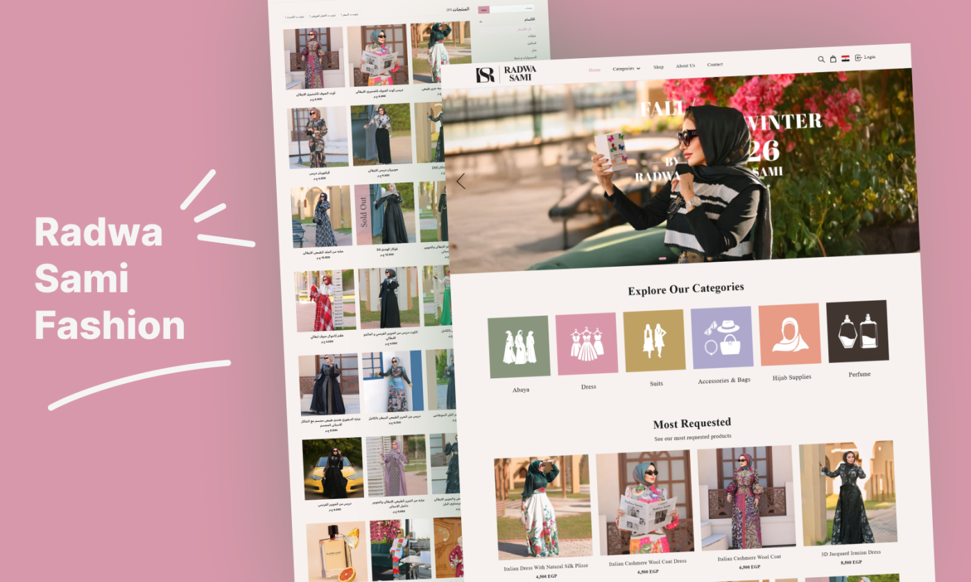 Radwa Sami is a premium fashion e-commerce platform developed to showcase high-end clothing collections, including dresses, abayas, suits, and exclusive designer pieces crafted from luxurious materials. The project focuses on delivering a sophisticated digital experience that reflects the elegance and exclusivity of the brand.